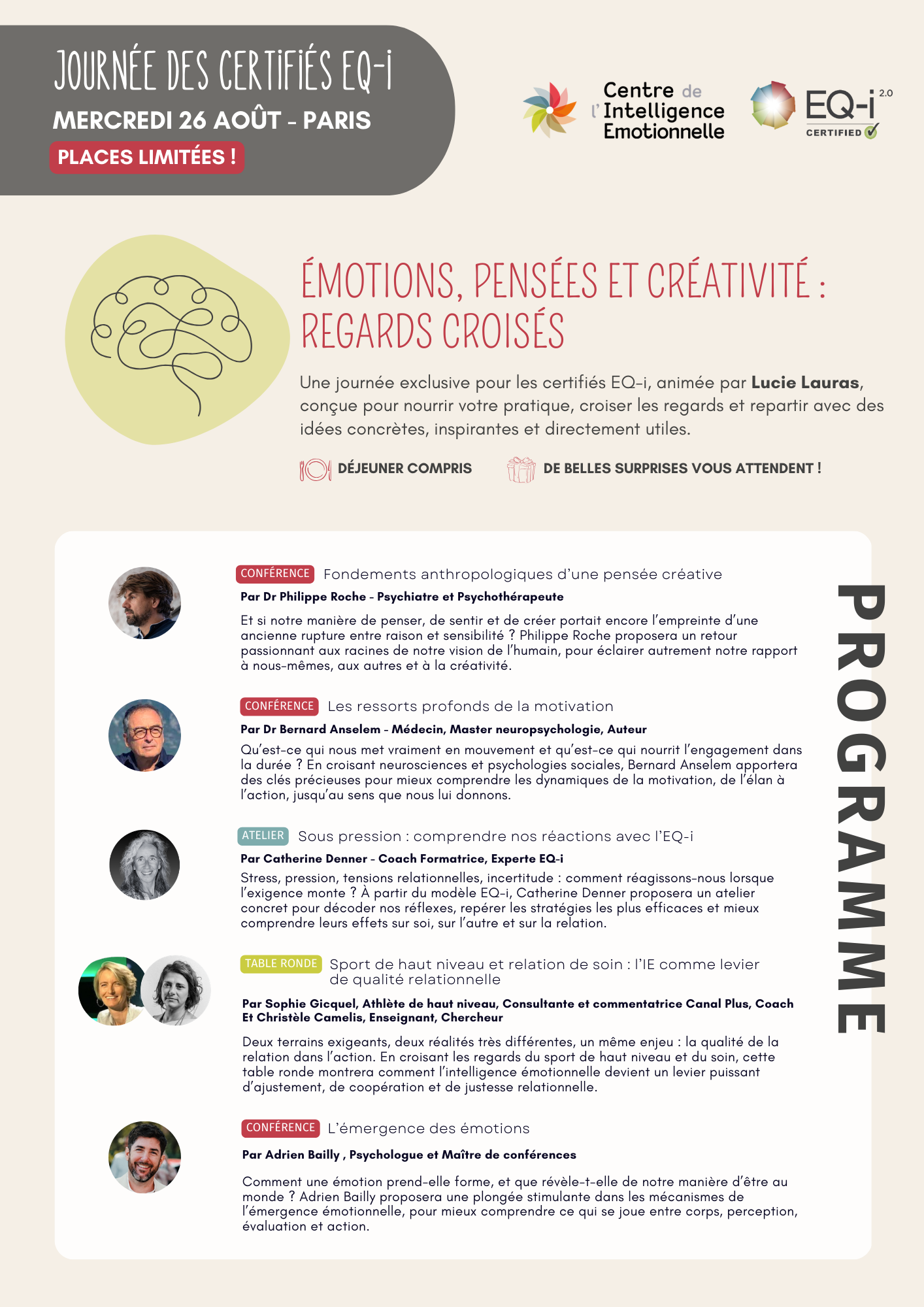 À la croisée des approches, des expériences et des expertises, cet événement propose d’explorer les liens entre intelligence émotionnelle, pensée et créativité, à travers des regards complémentaires et des éclairages concrets.
